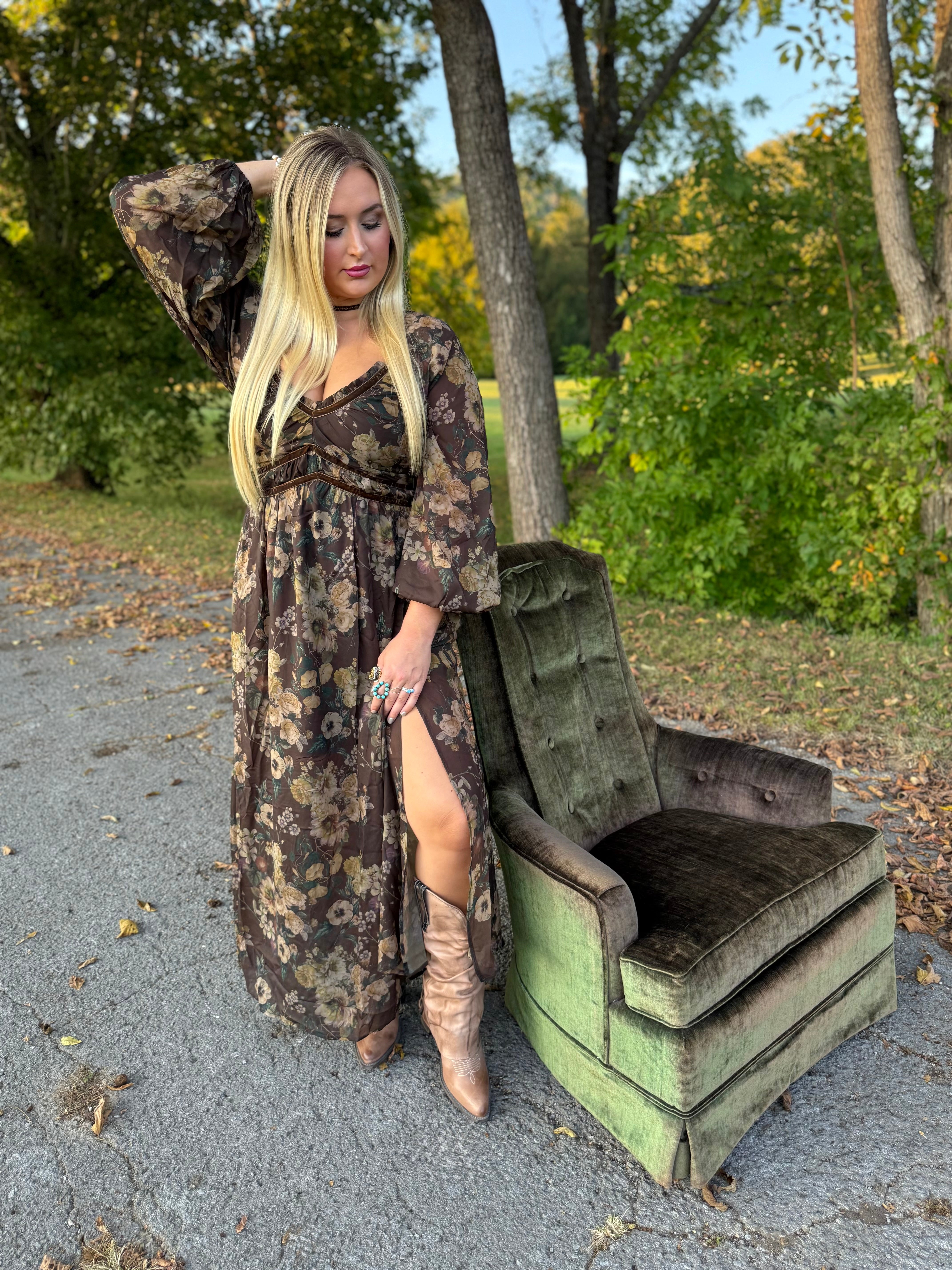 Floral Print Velvet Trimmed Maxi Dress with Slit